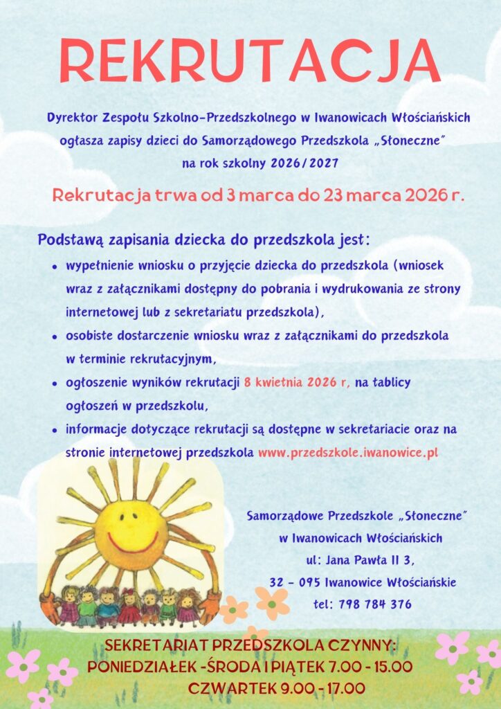 Dzień otwarty 19.03.2026r.REKRUTACJA 2026r. Dzień Babci i Dziadka 23.01.2026r.Zaproszenie na Jasełka w ZSOŻyczenia świąteczne 23.12.2025r.Spotkanie Wigilijne 19.12.2025r.Spotkanie z Panią Pielęgniarką 27.10.2025rProjekt „Gramy w zielone” 24.10.2025rCzekoladowy Autobus 21.10.2025rDbaj o zdrowie – Marsz Kobiet 19.10.2025r.Próbna ewakuacja 16.10.2025r.Piramida zdrowia w grupie Żabki 15.10.2025rProjekt „Gramy w zielone”Dzień Anioła Stróża 02.10.2025r. Dzień chłopaka 30.09.2025rDzień Jabłka 29.09.2025r.Dzień Przedszkolaka22.09.2025r.Dzień PszczołySpotkanie z panami policjantamiUdział w akcji charytatywnej #fioletoweloveObchody Święta Odzyskania NiepodległościDzień Anioła StróżaSpotkanie z Mikołajem- grupa ,,Pszczółki”Spotkanie z Mikołajem- grupa ,,Żabki”Spotkanie z Mikołajem- grupa ,,Biedronki”JasełkaDzień DinozauraBal karnawałowy- grupa ,,Pszczółki”Bal karnawałowy- chłopcy z grupy ,,Biedronki”Bal karnawałowy- grupa ,,Żabki”I Dzień Wiosny Konkurs ,,Eko Marzanna”Konkurs ,,Eko Marzanna”Wycieczka do Motylarni w Ulinie Wielkiej grupa ,,Pszczółki”Wycieczka do Motylarni w Ulinie Wielkiej grupa ,,Żabki”Pożegnanie zerówki